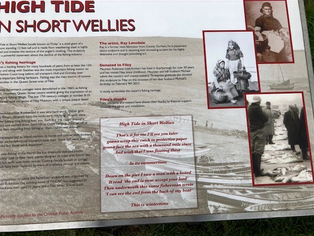 It was now Saturday and we went to explore the seafront. The walk down to the front took us back through the town. The weather looked unsettled, but we decided to carry on. Filey seafront was mostly nice, with things to do and well-tended ornamental gardens. We walked along the front to the northern end, which was uncomfortably busy. There were lots of people gathering around cafes and beach shops. It didn’t feel right, social distancing wasn’t being observed and we made a quick retreat back up the promenade. As we walked back up the promenade, we came across the statue below which is called ‘High Tide in Short Wellies’. The statue commemorates Filey’s fishing heritage and was the subject that was named following a competition ‘Finlay’ by an 11-year boy. It is a nice story and a very impressive statue. We went for lunch and after more shopping returned to the Motorhome. A very enjoyable day out, despite the ‘mixed’ weather.